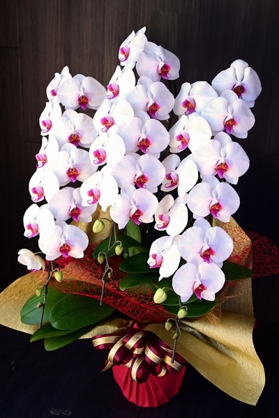 新規オープンのお店などでは「赤色のお花」が縁起が悪いと敬遠される事もありますが、白色の胡蝶蘭に赤いワンポイントで彩られた胡蝶蘭は、気品さと華やかさを併せ持ち、新しい門出のお祝いとしてもとてもおすすめです。