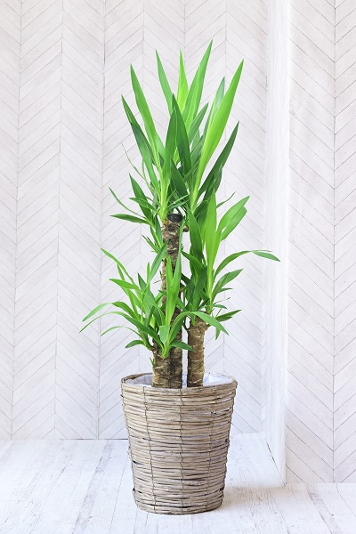 こちらはライトグレーを基調とした柳を編み上げた鉢カバーがセットになっています。深型なので背の高いユッカでも安定感があり、飽きの来ないシンプルなデザインでどんな空間にもマッチします。
