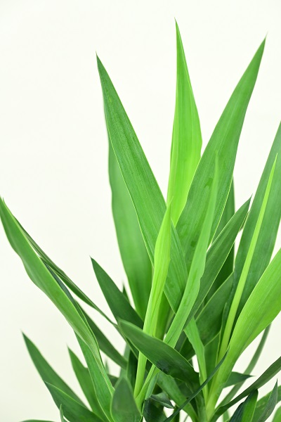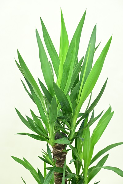 中米~北米にかけて多く分布するユッカは、太くしっかりとした幹から噴水のように上向きに茂らせる葉が特徴的な植物です。成長が早く、ぐんぐんと伸びる姿から成長期の青年を連想させ、そこから「青年の木」という別名がつきました。原産地では5メートルを超える高木ですが、鉢植えの場合は人の背丈ほどの大きさで、室内に飾ると存在感がありシンボルツリーとしても楽しんでいただくことができます。